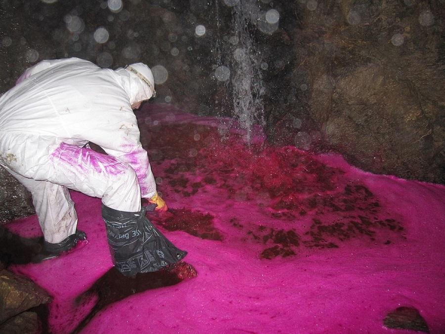 Thomas Breu gibt im Viamala-Bach in der Bettenhöhle den roten Farbstoff Sulforhodamin B ein. Der weisse Vliesanzug verhindert, dass der Farbstoff an die Höhlenkleider gelangt und später in der Höhle verschleppt wird. (18.05.2013, Foto: Simon Berger)