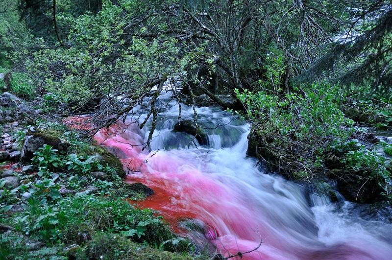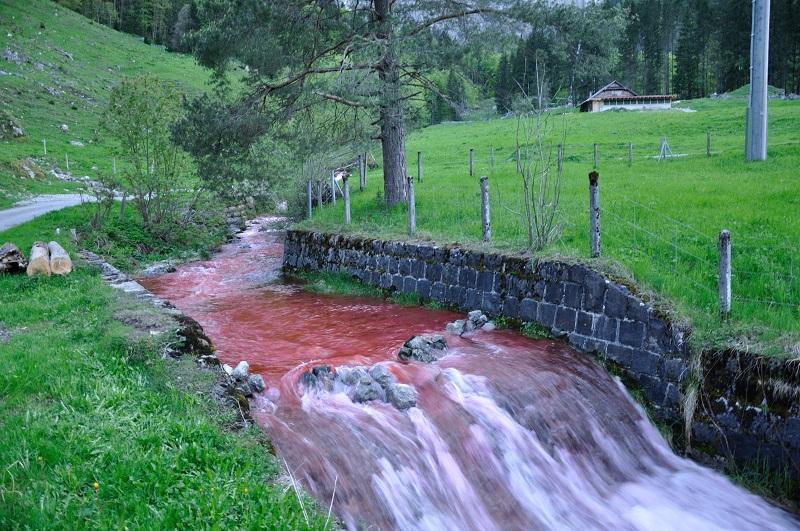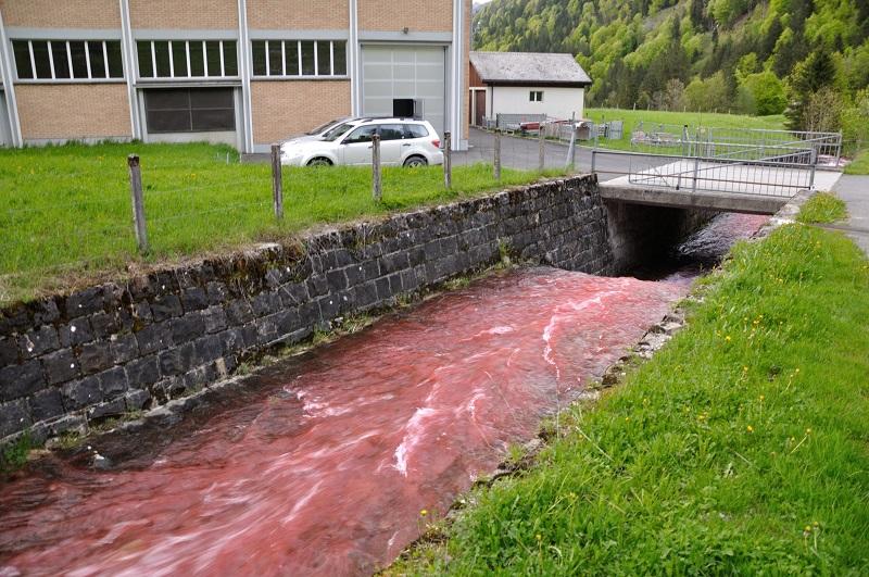 Hugschwendibach mit Sulforhodamin B, bei EWO Zentrale Hugschwendi. (18.05.2013, Foto: Jörg Weyermann)