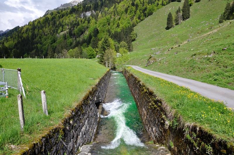 Das grün gefärbte Wasser des Hugschwendibaches mischt sich bei der EWO Zentrale Hugschwendi mit dem "sauberen" Wasser aus dem Melchsee.