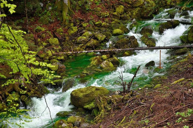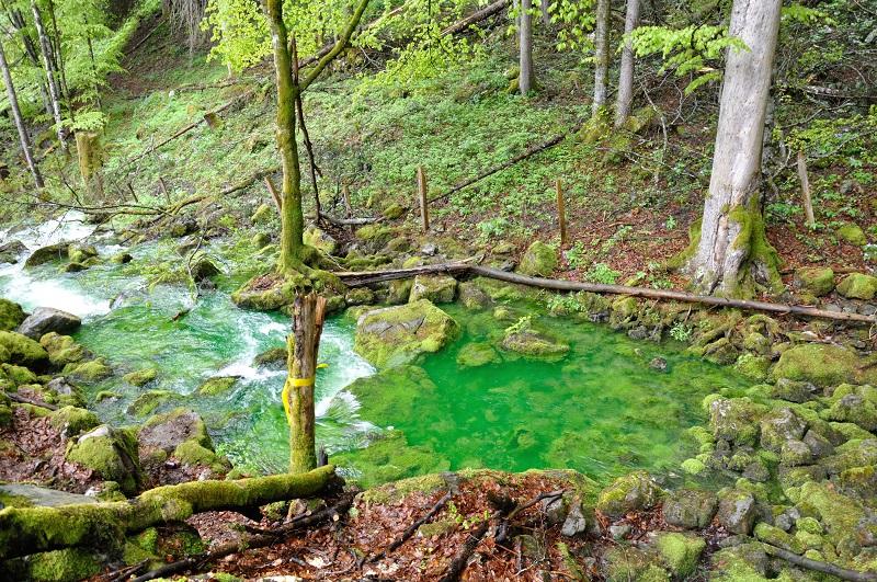 Der grün gefärbte Hugschwendibach unterhalb des Quelltopfes. (19.05.2013, Foto: Jörg Weyermann)