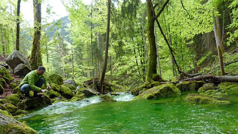 HGU-Mitglied Rolf Boller entnimmt beim Quelltopf des Hugschwendibachs eine Wasserprobe. (19.05.2013, Foto: Martin Trüssel)