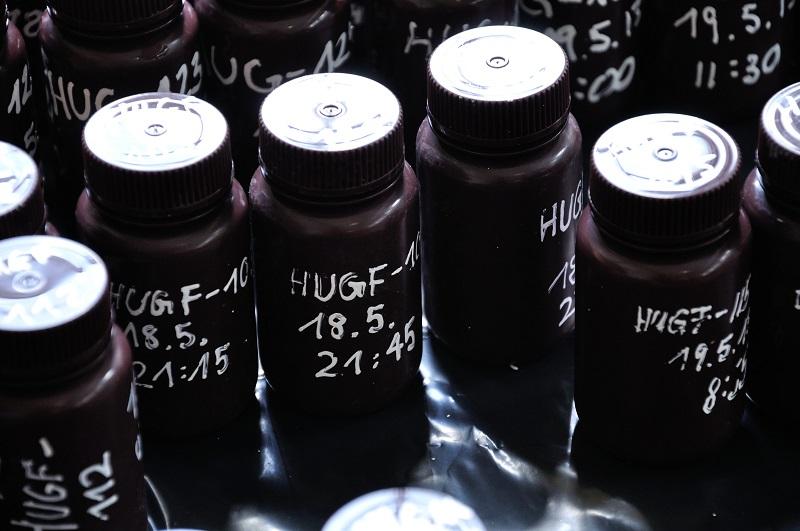 Das ist die "Ausbeute" des Markierversuches: 110 Fläschchen mit Wasserproben (Bild), 53 Kohlesäckchen. (20.05.2013, Foto: Jörg Weyermann)