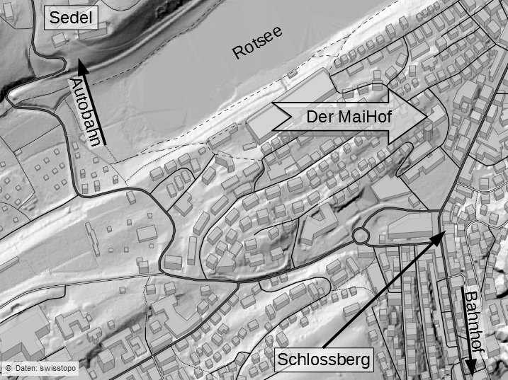 Mit dem Auto (nur beschränkte Parkmöglichkeiten vorhanden: Parkhaus Schlossberg oder Zürichstrasse): Autobahnausfahrt Emmen-Süd via Sedel zum Schlossberg / Maihof benützen.